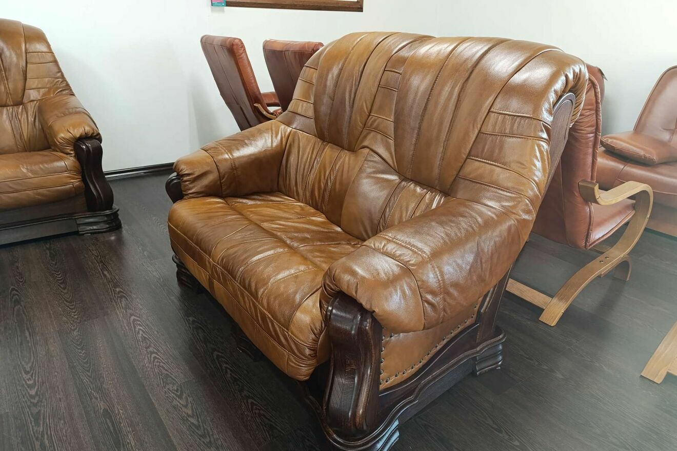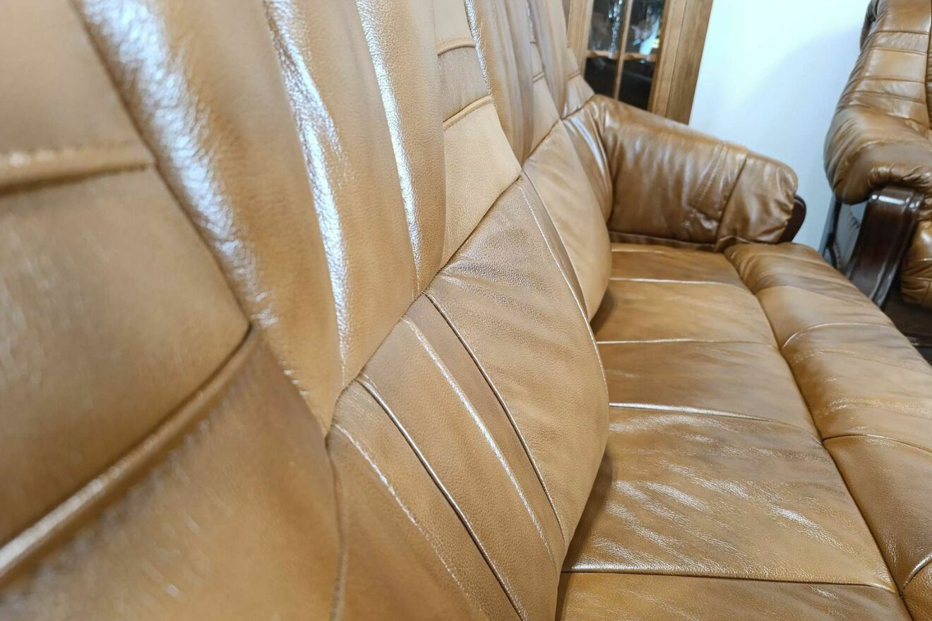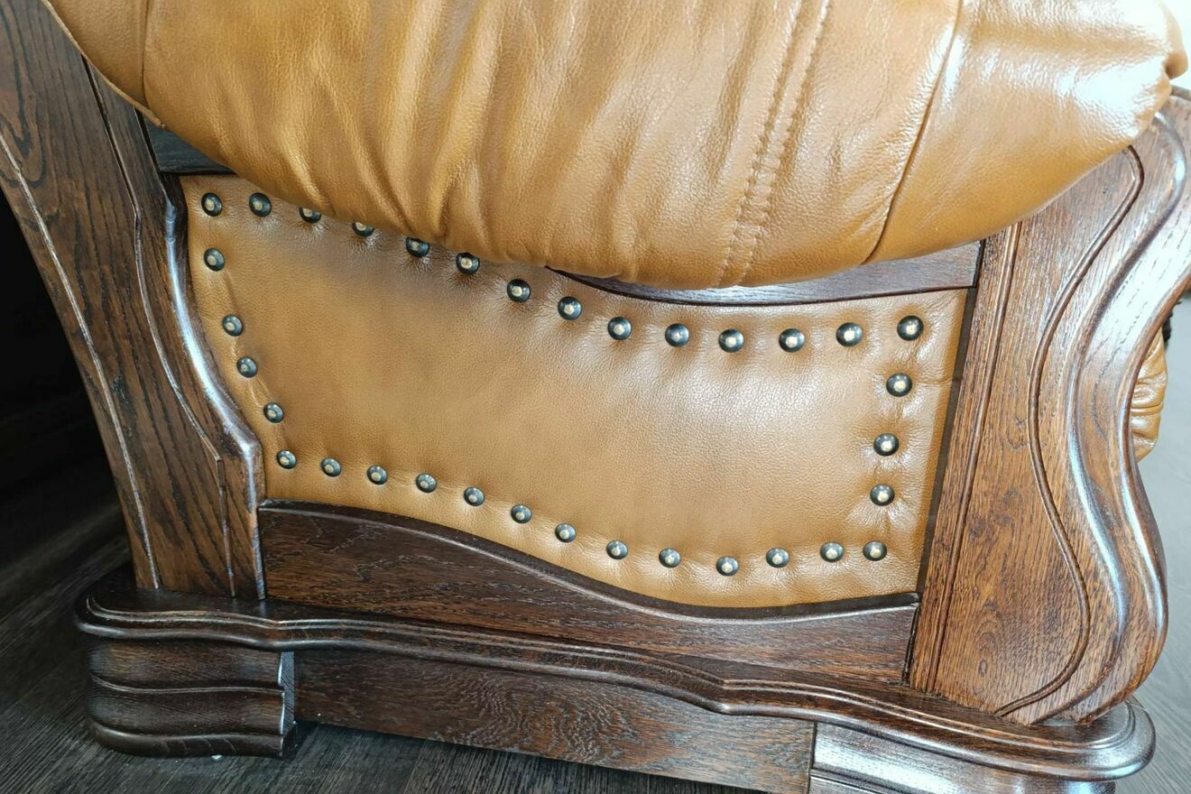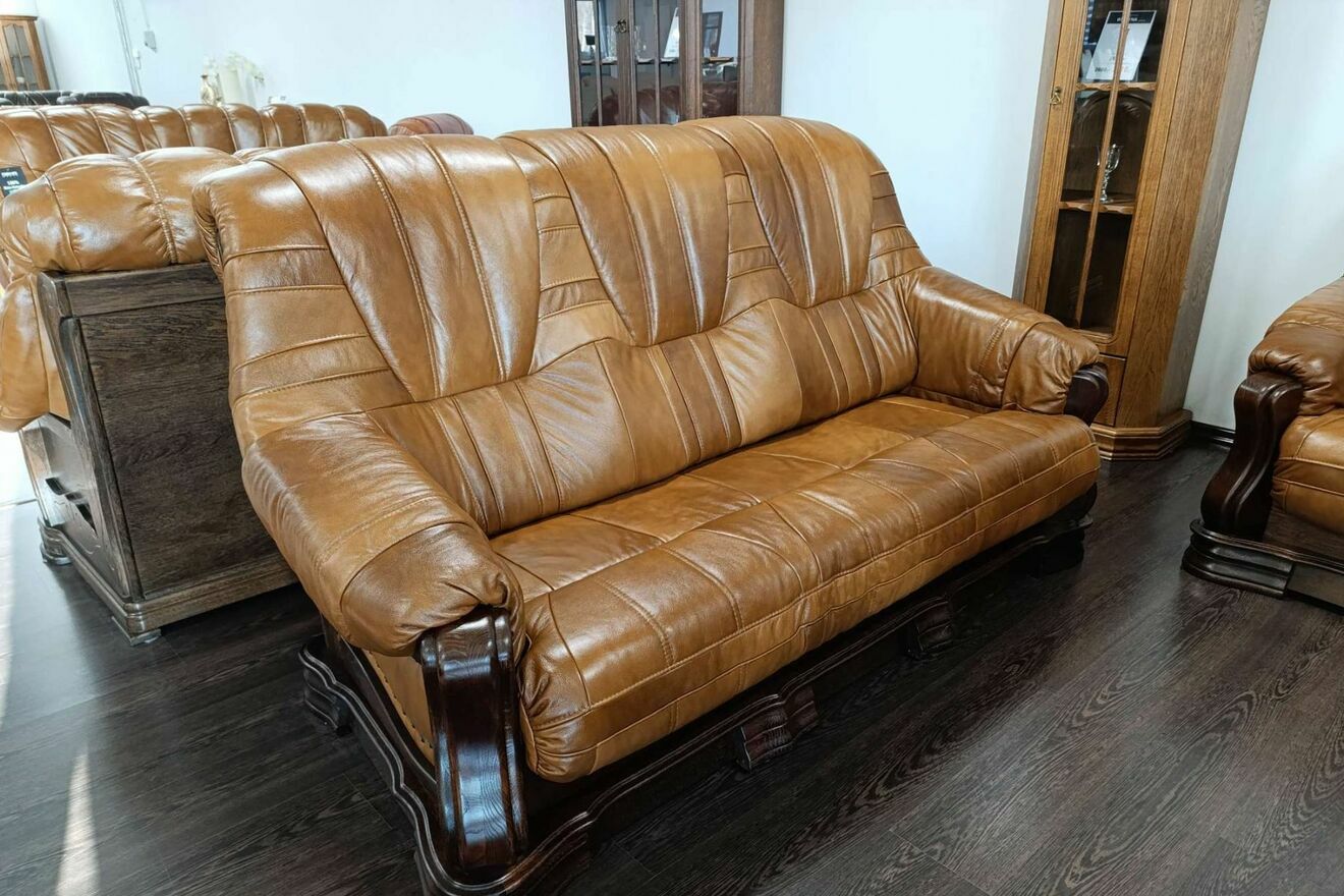Komplet Patrycja ma bardzo bogaty, masywny stelaż dębowy z bokami obitymi skórą naturalną oraz cekinami. Głębokie siedziska i wysokie oparcia gwarantują pełne podparcie dla nóg i kręgosłupa, zapewniając komfort użytkowania. Jeden z najwygodniejszych!Meble wykonane na stelażach drewnianych mają piękny elegancki design szczególnie polecany osobom kochającym bardziej klasyczne aranżacje. Drewno dębowe w połączeniu ze skórą naturalną tworzy niesamowity klimat we wnętrzu