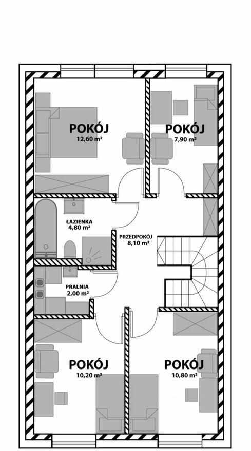 Ergonomiczne rozplanowanie pomieszczeń zapewnia komfortowe użytkowanie przez rodzinę liczącą nawet 5-6 osób.